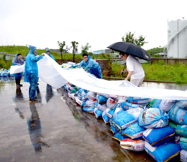 ? ? ? ? 2016年6月28日中午12時左右,溧陽地區(qū)連續(xù)強(qiáng)降雨使蕪申運(yùn)河水位由早上8點的4.5米急速上升至5.5米,水面距離公司碼頭駁岸距離不到0.5米。發(fā)現(xiàn)這一情況,司能石化常務(wù)副總經(jīng)理吳土金立即組織和號召江蘇司能防汛抗洪小組第一時間緊急啟動一系列防汛抗洪應(yīng)急措施:
